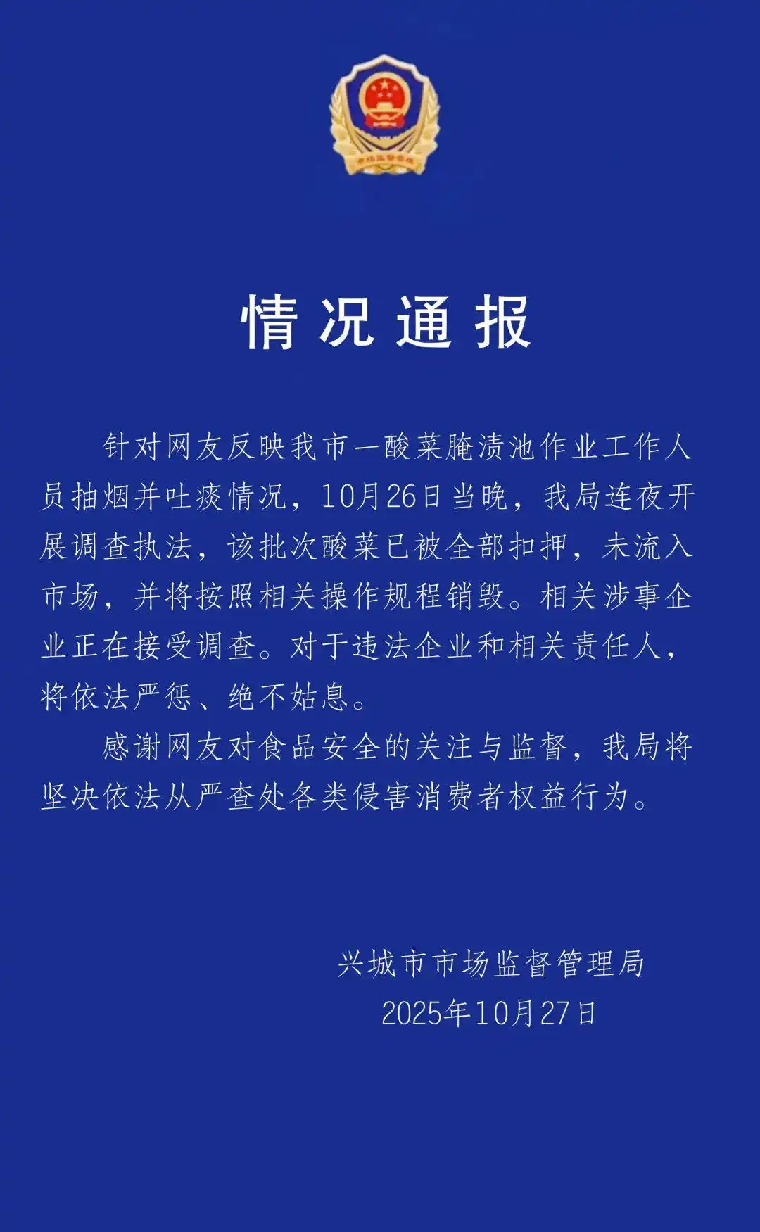 10月27日,遼寧省興城市市場監(jiān)督管理局通過微信公眾號“興城市市場監(jiān)督管理局”發(fā)布情況通報(bào)稱,針對網(wǎng)友反映的情況,10月26日當(dāng)晚,該局連夜開展調(diào)查執(zhí)法,該批次酸菜已被全部扣押,未流入市場,并將按照相關(guān)操作規(guī)程銷毀。涉事企業(yè)正在接受調(diào)查。對于違法企業(yè)和相關(guān)責(zé)任人,將依法嚴(yán)懲、絕不姑息。隨后,中國新聞網(wǎng)、光明網(wǎng)、觀察者網(wǎng)等媒體轉(zhuǎn)發(fā)報(bào)道。