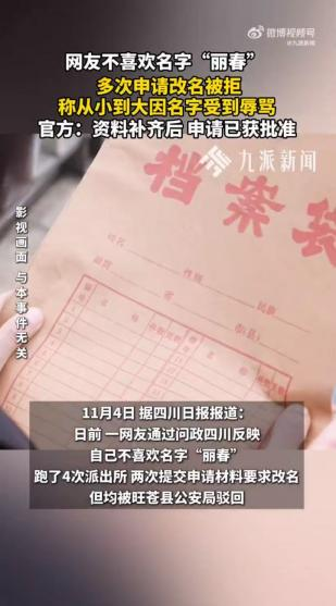 11月5日,據(jù)四川日?qǐng)?bào)微信公眾號(hào)報(bào)道,四川省廣元市旺蒼縣一位居民通過“四川省網(wǎng)上群眾工作平臺(tái)——問政四川”反映,自己不喜歡名字“麗春”,跑了四次派出所,兩次提交申請(qǐng)材料要求改名,但均被旺蒼縣公安局駁回。該網(wǎng)民訴苦說,自己從小到大因這個(gè)名字受到不少他人辱罵,造成了精神和心理傷害。