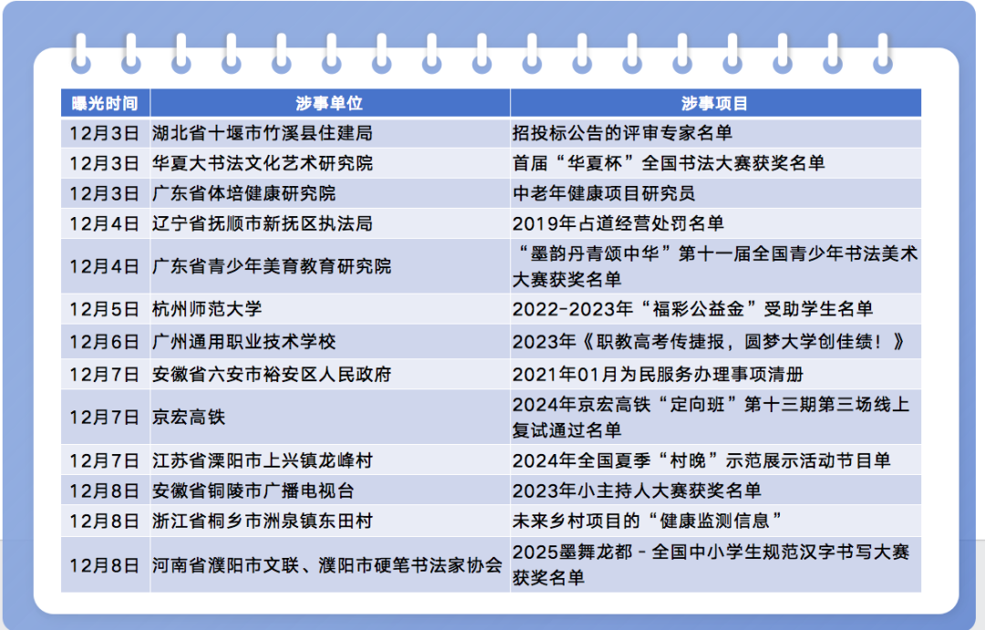 截至12月9日15時,全網(wǎng)相關(guān)信息達(dá)10萬余條,“#全網(wǎng)最忙五人組背后誰在造假#”“#人民日報評最忙五人組反復(fù)跨界#”“#職校高考喜報與人名大全高度重合#”“#該讓全網(wǎng)最忙五人組歇歇了#”“#公益項目受助名單照搬人名大全#”“#政府采購評審名單被指照搬人名大全#”“#新華社調(diào)查欄目追問最忙五人組#”“#安徽一政務(wù)清單被指照搬人名庫#”“#政府文件還要薅多少人名大全#”“#最忙五人組還是多項專利發(fā)明人#”“#全網(wǎng)最忙五人組造假裝都懶得裝了#”“#全網(wǎng)最忙五人組#” 等十多個詞條登上熱搜榜,閱讀量超7億次。