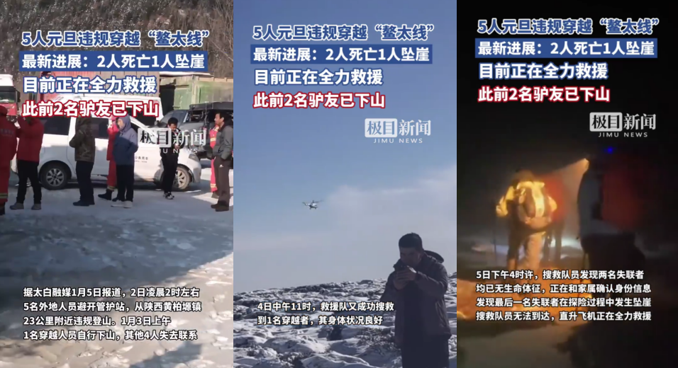 1月3日,有網(wǎng)民發(fā)帖稱“元旦期間5人穿越‘小鰲太線’,4人失聯(lián)”,引發(fā)關(guān)注。1月5日晚,“太白融媒”微信公眾號發(fā)布通報(bào)稱,1月2日凌晨2時(shí)左右,5名外地人員避開管護(hù)站,從黃柏塬鎮(zhèn)23公里附近違規(guī)登山。1月3日上午,1名穿越人員自行下山,其他4人失去聯(lián)系。當(dāng)?shù)仉S后組織救援人員進(jìn)山全力搜救。1月4日11時(shí),救援隊(duì)成功搜救到1人,其身體狀況良好。1月5日下午4時(shí)許,救援隊(duì)又發(fā)現(xiàn)2名失聯(lián)者,已無生命體征,同時(shí)發(fā)現(xiàn)最后1名失聯(lián)者在探險(xiǎn)過程中發(fā)生墜崖事故,現(xiàn)場坡陡崖高,搜救隊(duì)員無法到達(dá),出動(dòng)了直升機(jī)全力救援。