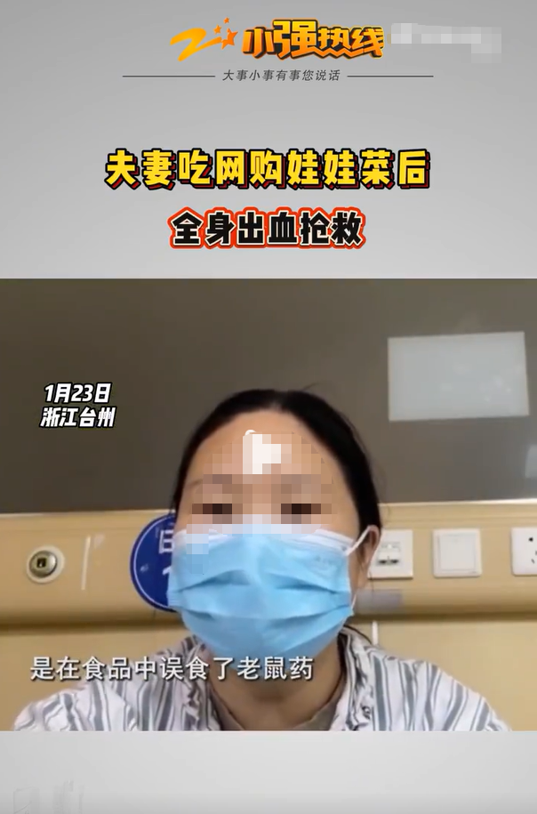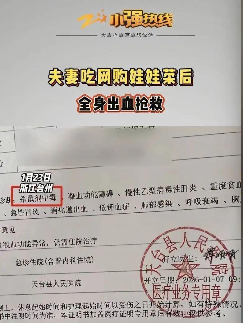 1月23日,浙江衛(wèi)視科教頻道小強熱線節(jié)目報道稱,浙江臺州天臺縣楊女士和丈夫于2025年12月網購娃娃菜,食用后夫婦倆同時出現(xiàn)全身出血癥狀,入院搶救。醫(yī)院診斷結果顯示,夫婦倆均為老鼠藥中毒。1月12日,夫婦倆選擇報警。警方檢測了楊女士家中物品,從娃娃菜中檢測出了老鼠藥。隨后,天臺縣公安局受理了楊女士夫婦報稱的“森逸軒花卉園藝生產、銷售有毒、有害食品案”。
