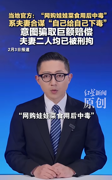 19時,“紅星新聞”微信公眾號發(fā)布消息稱,記者從浙江臺州天臺縣相關官方人士處進一步了解到,警方在進一步偵查過程中發(fā)現(xiàn),丈夫的下毒行為系夫妻雙方共謀,兩人試圖通過網購娃娃菜食用后制造中毒跡象,以此要挾,向平臺或商家騙取巨額賠償。但最終被警方偵查識破。該人士指出,“他其實不是給他老婆下毒”,夫妻二人為了騙取錢財“自己給自己下毒”。目前,楊女士、陳某波均已被刑拘。網民對此普遍表示震驚與譴責,稱其“手段太狠”“不惜拿生命做賭注,上演現(xiàn)實版苦肉計”,并認為二人被處罰是“自食惡果”。