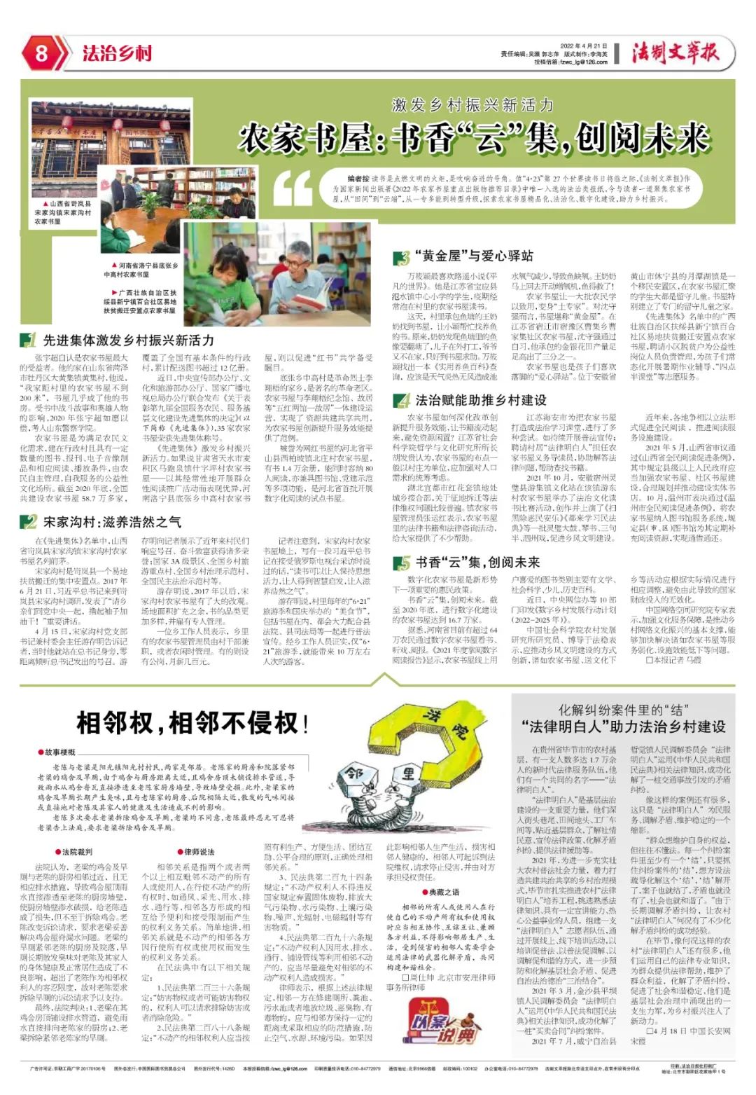 讀書是點燃文明的火炬,是吹響奮進的號角。值“4·23”第27個世界讀書日將臨之際,《法制文萃報》作為國家新聞出版署《2022年農(nóng)家書屋重點出版物推薦目錄》中唯一入選的法治類報紙,今與讀者一道聚焦農(nóng)家書屋,從“田間”到“云端”,從一專多能到轉(zhuǎn)型升級,探索農(nóng)家書屋精品化、法治化、數(shù)字化建設,助力鄉(xiāng)村振興。
