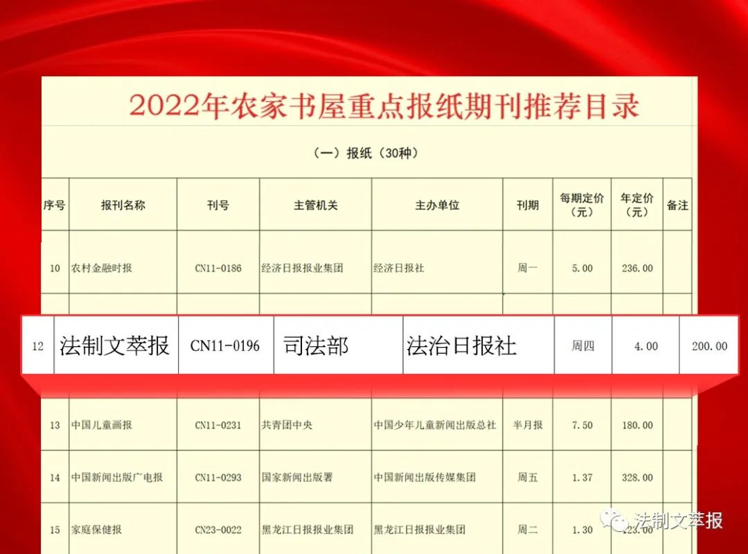 為深入學(xué)習(xí)宣傳貫徹習(xí)近平新時(shí)代中國(guó)特色社會(huì)主義思想,迎接黨的二十大勝利召開(kāi),指導(dǎo)各地做好2022年農(nóng)家書(shū)屋出版物補(bǔ)充更新工作,國(guó)家新聞出版署組織制定了《2022年農(nóng)家書(shū)屋重點(diǎn)出版物推薦目錄》。《推薦目錄》分重點(diǎn)圖書(shū)、重點(diǎn)報(bào)紙期刊、重點(diǎn)音像制品和電子出版物、重點(diǎn)少數(shù)民族文字圖書(shū)四類(lèi)?!斗ㄖ莆妮蛨?bào)》成為重點(diǎn)報(bào)紙期刊推薦目錄中唯一一家法治類(lèi)報(bào)紙。