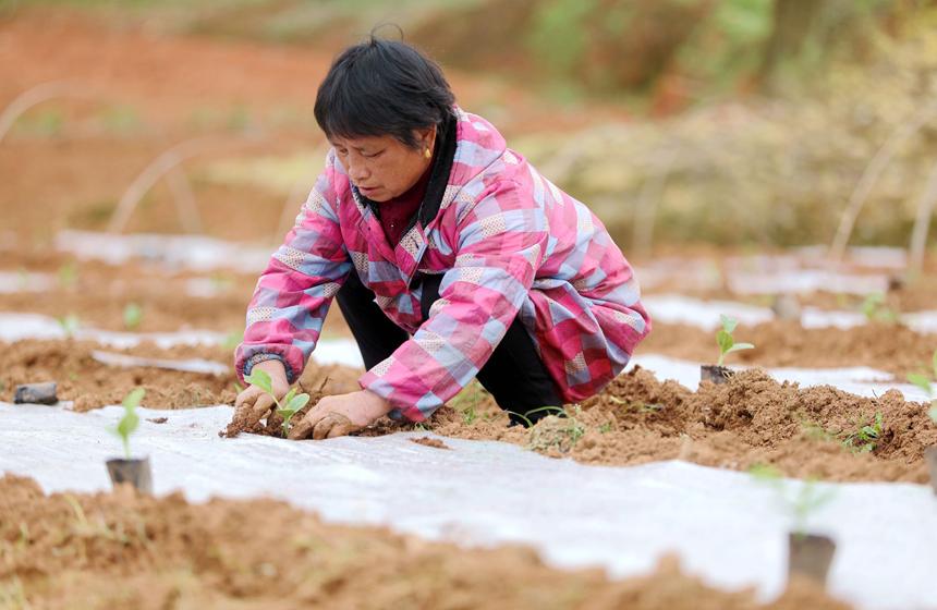 2月28日,江西省宜春市上高縣墨山鄉(xiāng)香山村蔬菜種植基地,菜農(nóng)正在種植蔬菜。近年來,在政策扶持和農(nóng)業(yè)技術(shù)支持下,該村大力發(fā)展黃土地蔬菜種植,黃瓜、苦瓜、豆角、茄子等綠色蔬菜銷往全國多地,讓當(dāng)?shù)夭宿r(nóng)在家門口就業(yè)增收。