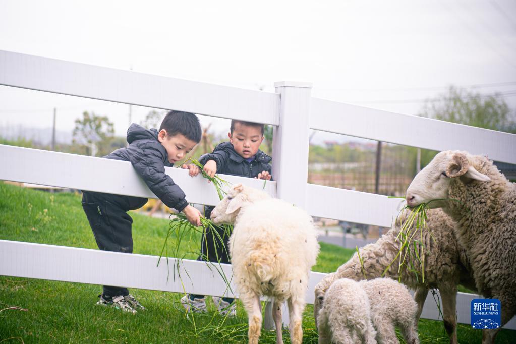 3月29日,小游客在諸暨市楓橋鎮(zhèn)杜黃新村的農耕體驗研學基地喂羊。記者 江漢 攝