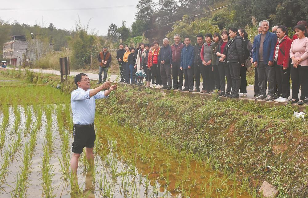 永定區(qū)2023年第七期高素質(zhì)農(nóng)民培訓(xùn)班上,專(zhuān)家在田里講授早稻病蟲(chóng)害防治知識(shí)。