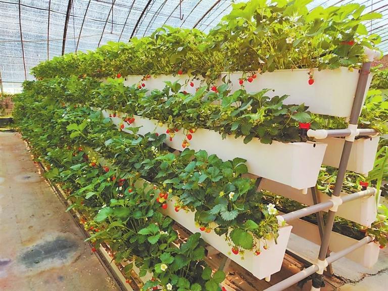 高架栽種的草莓。記者 于曉明 攝