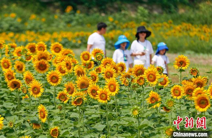 8月9日,游客在黃山市屯溪區(qū)屯光鎮(zhèn)漢沙村欣賞盛開的向日葵花。施亞磊 攝