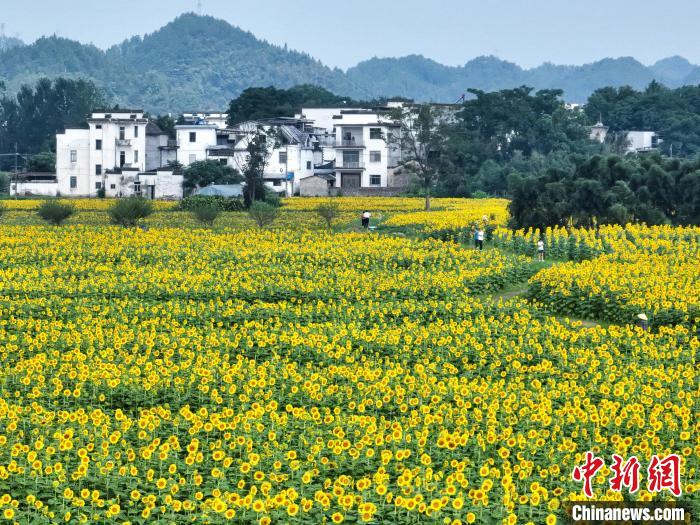 8月9日,游客在黃山市屯溪區(qū)屯光鎮(zhèn)漢沙村欣賞盛開的向日葵花。(無人機(jī)照片)施亞磊 攝
