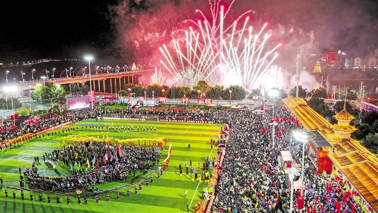 19時(shí)30分,澳門職工聯(lián)隊(duì)與貴州村超聯(lián)隊(duì)友誼賽結(jié)束后,“村超村晚”文藝展示又將整場活動(dòng)推向高潮。這場晚會(huì)由民風(fēng)民俗展新顏、鄉(xiāng)村足球超快樂、貴山貴水迎貴客、龍騰盛世慶豐年4個(gè)篇章組成,參演演員近2300人。據(jù)相關(guān)負(fù)責(zé)人介紹,此次文藝展示的內(nèi)容均以榕江“村超”自創(chuàng)節(jié)目為主,同時(shí),澳門舞醉龍表演隊(duì)在龍騰盛世慶豐收環(huán)節(jié)與貴州的舞龍隊(duì)伍共同演出,展示出兩地文化的互通互融。本次文藝展示強(qiáng)調(diào)“草根”和民族文化,吸引了上萬人現(xiàn)場觀看,在演出的尾聲,一場持續(xù)10余分鐘的煙花秀點(diǎn)亮了榕江縣的夜空,“文化味、民族味、傳承味、年味”十足的“村超村晚”在觀眾和游客的掌聲與歡呼聲中落下帷幕。