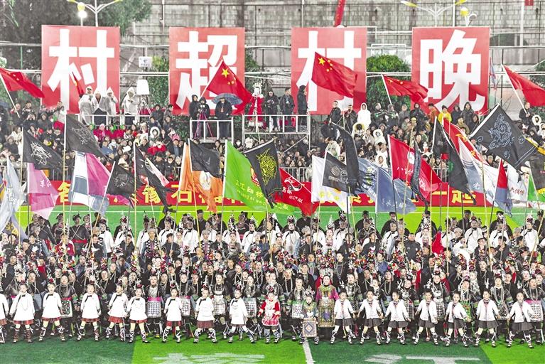 當(dāng)天15時(shí)30分,“村超村晚”活動(dòng)現(xiàn)場及分會(huì)場已是人頭攢動(dòng)。年貨大集上,當(dāng)?shù)卮迕駧砻缋C蠟染、鮮果特產(chǎn)、風(fēng)物美食等百余種特色產(chǎn)品進(jìn)行展示銷售,游客大飽口福、眼福,熱烈氛圍讓人歡欣鼓舞。在賽場上設(shè)立的“村晚”龍門陣演播室里,過去一年中,從“村超”涌現(xiàn)的球員、教練、啦啦隊(duì)員、解說員、幕后工作者及外地游客等代表性人物,通過現(xiàn)場“互動(dòng)訪談+短視頻”的形式,從不同的角度與視野暢談“村超”故事和“村超”夢想。