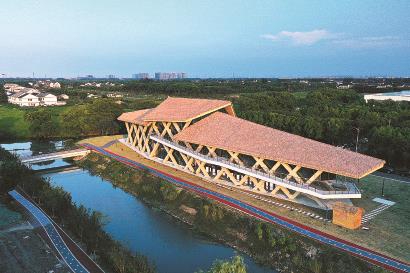 奉賢南橋“鄉(xiāng)村最美水岸會(huì)客廳”披著金色霞光置身綠野 記者 李茂君 攝