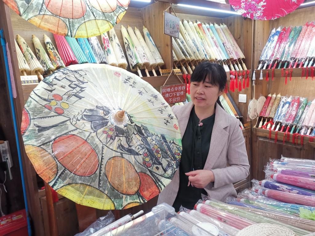 4月16日,曹文娟在江西省上饒市婺源縣篁嶺甲路紙傘店鋪展示非遺紙傘 記者 王小鵬 攝