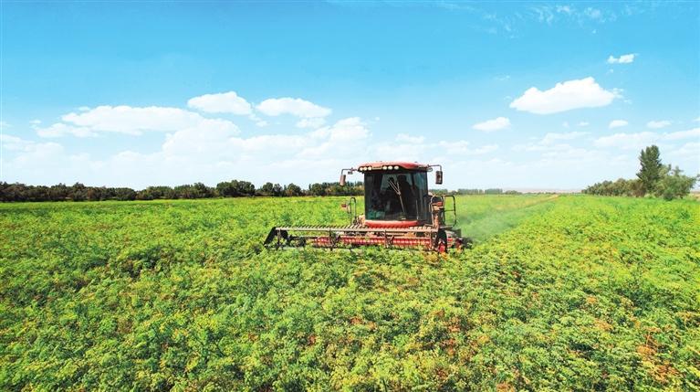 但見地里的苜蓿有高有低、呈波浪狀?!澳闱疲覀冝r(nóng)場進行植株高低搭配,將個頭較高的WJ363HK苜蓿與個頭低的阿蒂娜間作套種,當(dāng)苜蓿大面積開花時,能充分享受陽光,提高苜蓿牧草的粗蛋白含量。”趙富強說著算了一筆賬:今年6月10日到20日,頭茬苜蓿成熟,19臺大型機械搶趕時間,一個多星期就收割結(jié)束,保障了粗蛋白含量高達20%以上;目前第二茬苜蓿只有40厘米高,長到7月下旬80厘米左右即可收割;第三茬苜蓿到9月中下旬時收割。1畝苜蓿收割3茬、可產(chǎn)900公斤至1噸干草,按照目前市場價1噸干草1600至1800元計算,收益可觀。