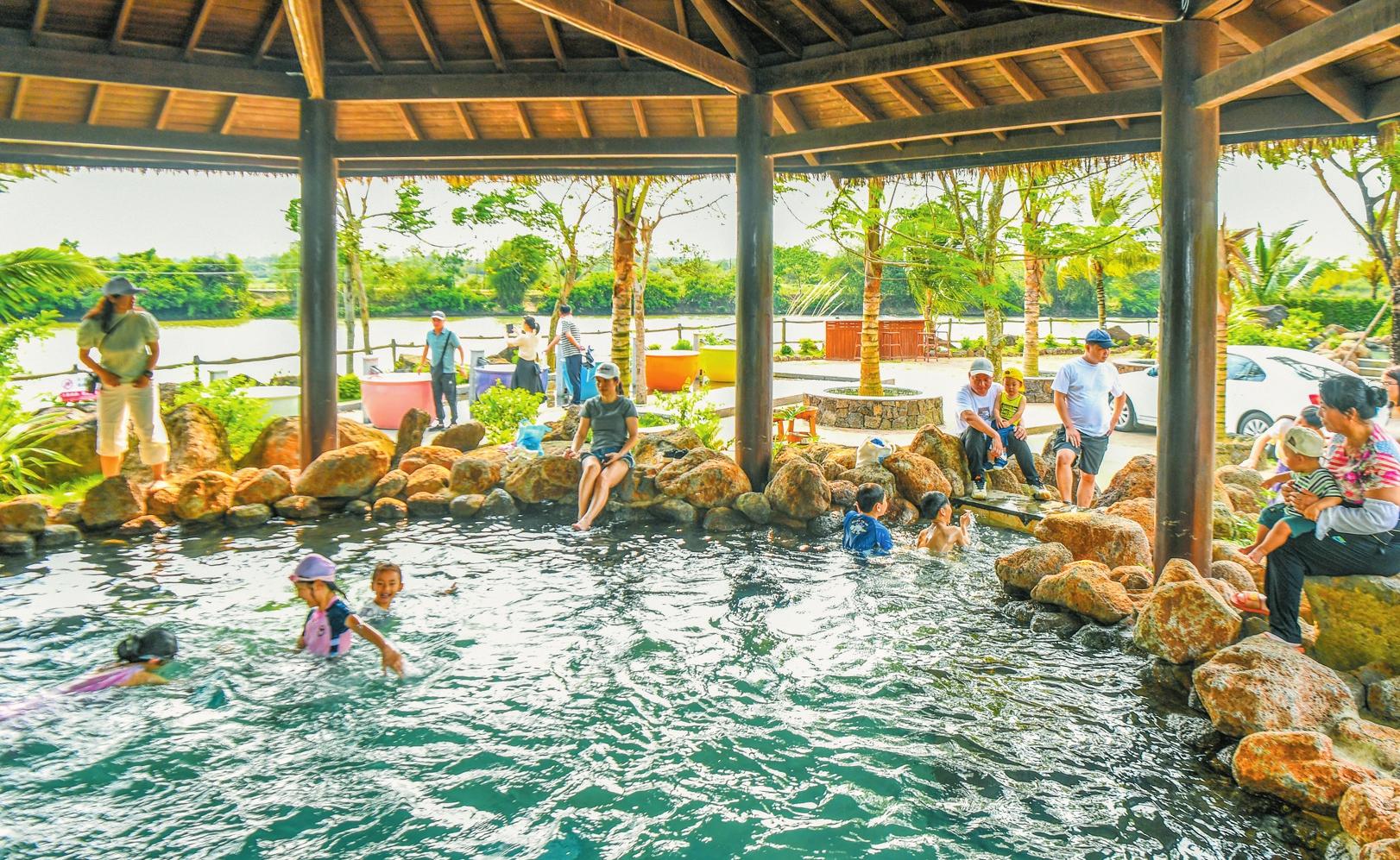 家長(zhǎng)帶孩子在龍華區(qū)新坡鎮(zhèn)潭豐洋火山濕地農(nóng)莊泡冷泉 記者 康登淋 攝