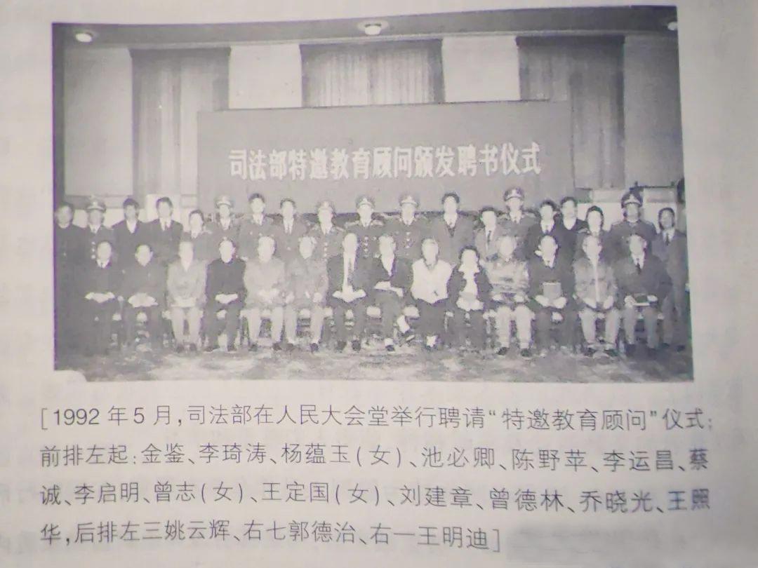 1992年5月,司法部會同中國關(guān)心下一代工作委員會,聯(lián)合聘請陳野蘋、曾志、王照華、池必清、喬曉光、李啟明、李運昌、劉建章、何光、曾德林、楊蘊玉、張文松、李琦濤、王定國等十四位老同志擔任“司法部特邀教育顧問”,并在人民大會堂舉行了隆重的頒發(fā)聘書儀式。在這批德高望重的革命前輩的熱情參與下,監(jiān)獄管理機關(guān)的教育改造質(zhì)量和社會影響力有了新的提升。由于工作原因,我有幸親歷和見證了他們到監(jiān)獄開展幫教活動的一幕幕感人至深的場景。
