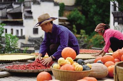 穿上傳統(tǒng)的農(nóng)民服飾,吳仙鳳每天用農(nóng)作物作畫,為游客表演篩辣椒、晾南瓜,這取代務(wù)農(nóng)成了她的主業(yè),隨著越來(lái)越多的游客來(lái)到篁嶺,吳仙鳳的收入也越來(lái)越高。