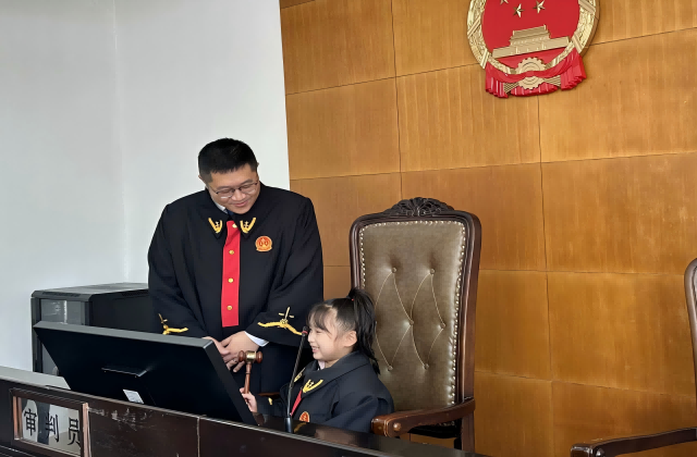 小朋友們在工作人員的帶領下步入審判庭,他們穿上法袍,坐上審判席,敲響法槌,深度體驗“小法官”的角色。在工作人員的演示與指導下,孩子們進一步知曉了法庭工作人員的職責。
