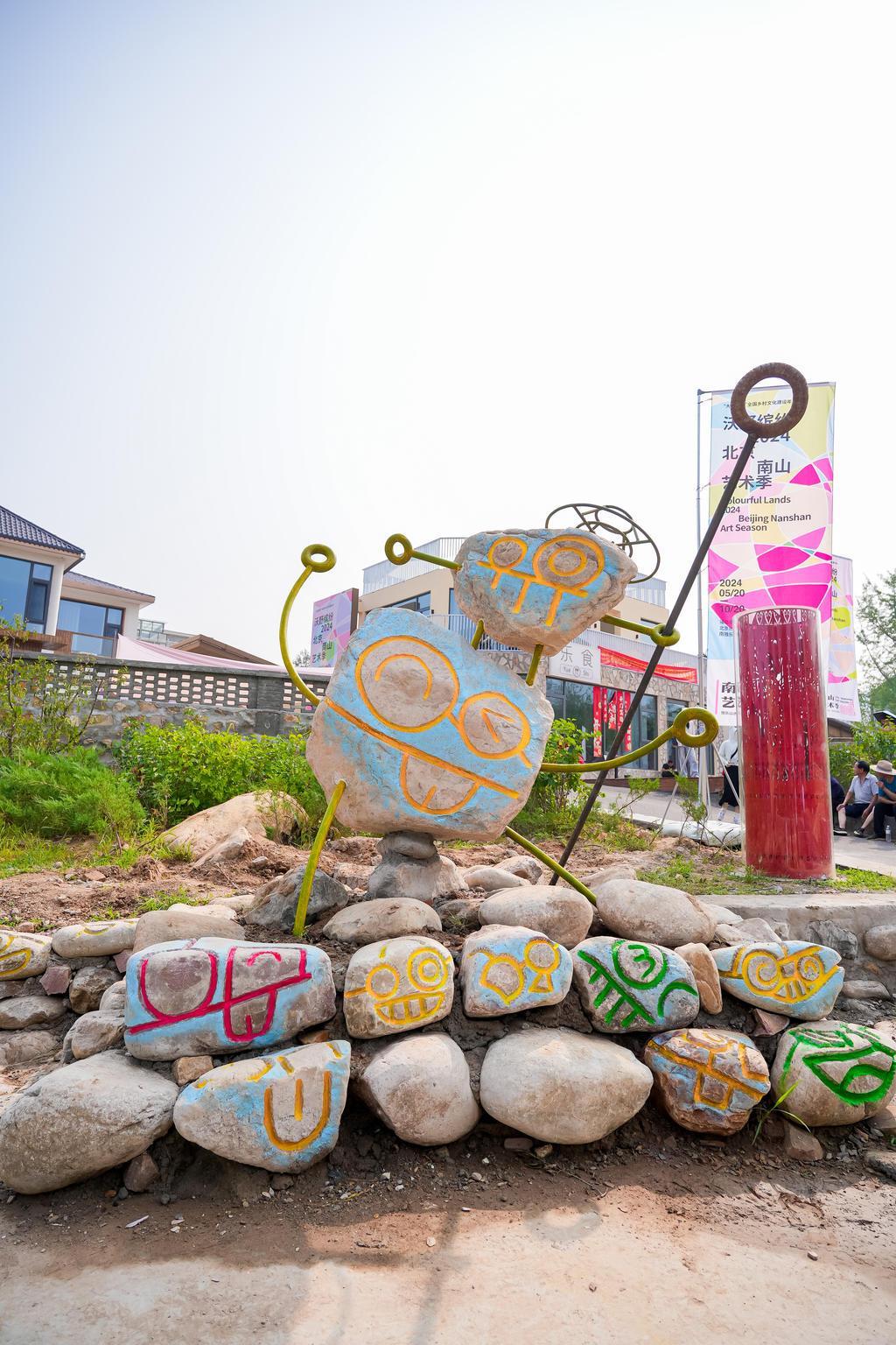 如今,南山村村口灰撲撲的石頭圍墻變成了一面豐收墻,大家把石頭涂畫成白菜、柿子、大桃等果蔬的樣子;清華美院在胡同安裝了交互感應(yīng)裝置,夜晚有人走過,就會投射出一只奔跑的夜光兔子;北京林業(yè)大學(xué)用玻璃飲料瓶復(fù)現(xiàn)了村里曾經(jīng)出土的文物石馬,名為《馬放南山》……環(huán)境變好了,加上南山藝術(shù)季的帶動效應(yīng),村民的柿子、山里紅、核桃也都賣出去了,鄉(xiāng)村建設(shè)還讓村里的石匠、瓦工有了在家門口掙錢的機會。