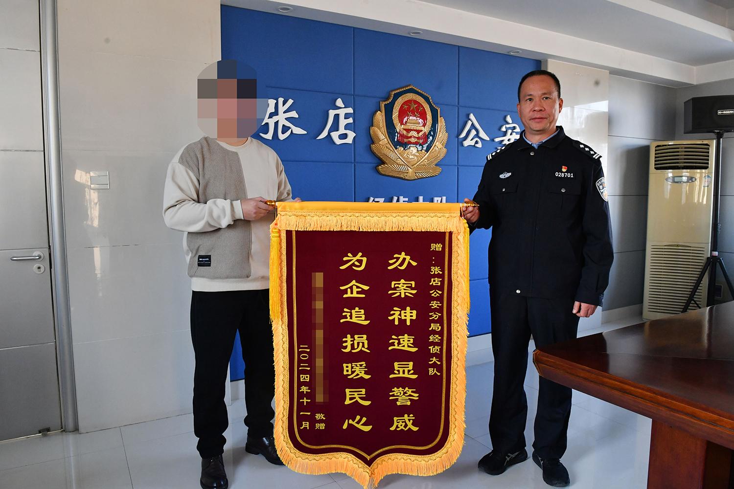 11月7日下午,一場(chǎng)小型退贓儀式在經(jīng)偵大隊(duì)會(huì)議室內(nèi)舉行,民警將12萬元現(xiàn)金現(xiàn)場(chǎng)返還給了企業(yè)負(fù)責(zé)人。為表示感謝,企業(yè)負(fù)責(zé)人也將提前制作好的印有“辦案神速顯警威 為企追損暖民心”的錦旗送到了民警手中。