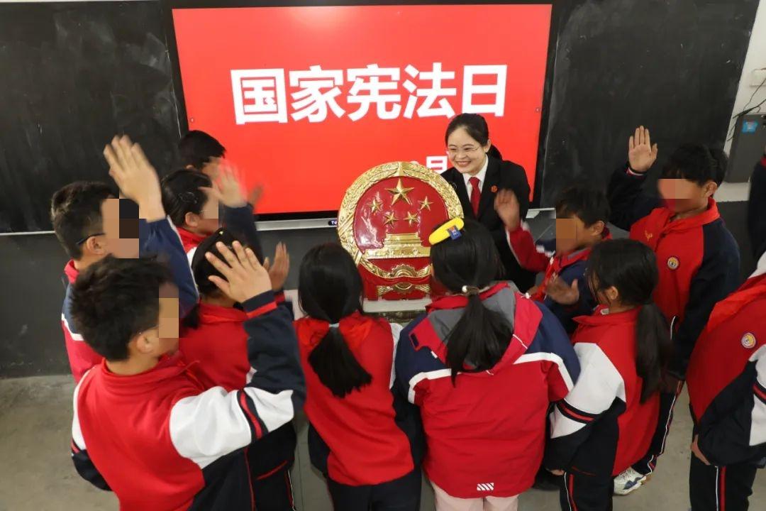 “國(guó)徽是什么顏色的?中間的五角星代表著什么……”“法官姐姐”向同學(xué)們?cè)敿?xì)講解國(guó)徽的圖案、顏色、尺寸、制作、使用等規(guī)定,幫助他們認(rèn)識(shí)國(guó)徽、了解國(guó)徽。隨后,“法官姐姐”進(jìn)行現(xiàn)場(chǎng)提問,同學(xué)們踴躍舉手回答,現(xiàn)場(chǎng)氣氛歡快熱烈。