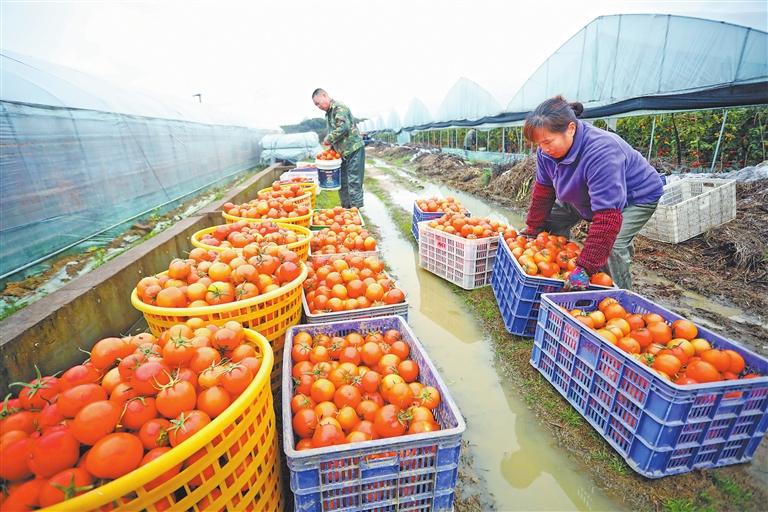 樂(lè)安縣山碭鎮(zhèn)流芳村西紅柿種植基地,村民正在搬運(yùn)采摘好的西紅柿 通訊員 邱志超 攝