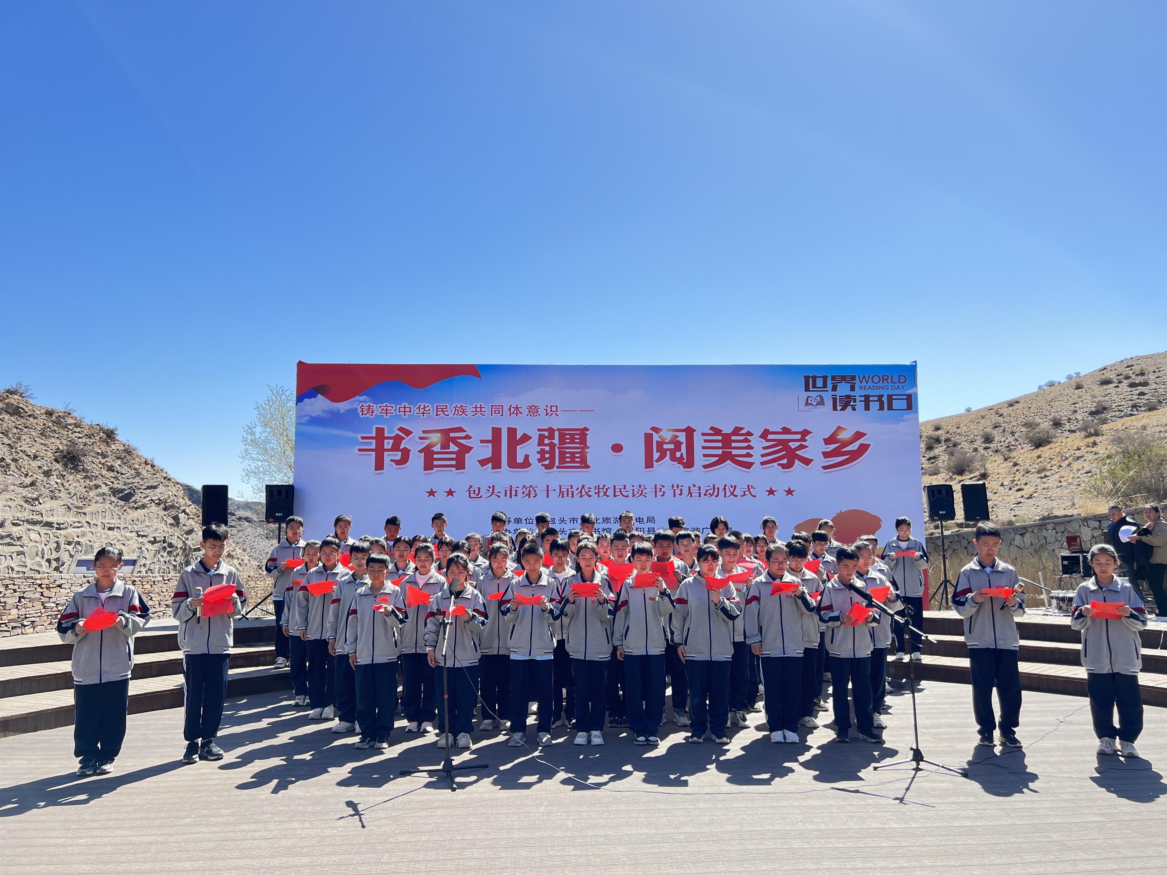 第十屆農(nóng)牧民讀書節(jié)上,固陽縣第三中學(xué)的學(xué)生開展集體誦讀活動(dòng)(包頭市圖書館供圖)