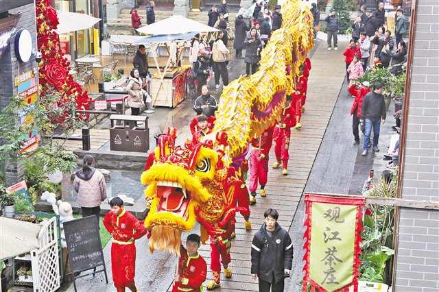 重慶高新區(qū)走馬古鎮(zhèn)用非遺點(diǎn)燃游客的熱情:春節(jié)期間,舞龍隊(duì)、舞獅隊(duì)、花船、腰鼓隊(duì)等在古鎮(zhèn)里巡游;當(dāng)?shù)卮迕褡跃幾匝莸纳徍嵨琛Ⅳ~燈舞等吸引了十里八鄉(xiāng)的村民前來打卡。
