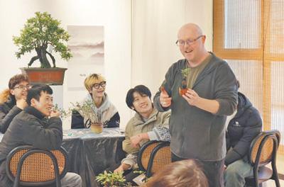 茅檐石壁的傳統(tǒng)民居,造型多變的川派盆景,位于四川崇州市觀勝鎮(zhèn)的嚴家彎灣,人和、景美、風光好。沿著蜿蜒曲折的小徑,走過幾處民居,便來到加拿大盆景師查德·辛克萊(中文名“白熊”)的小院。受外婆影響,白熊自小便對中國傳統(tǒng)文化充滿好奇。因熱愛中式盆景,他來到中國潛心學習研究,一晃已過去20多年。