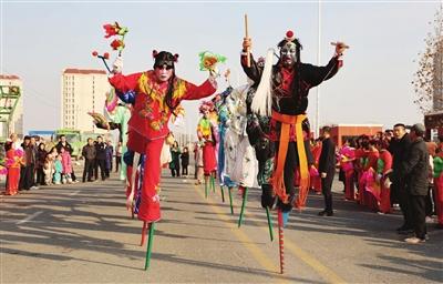 春節(jié)前夕高莊戶村村民進行高蹺表演。資料照片