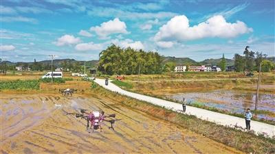 星橋鎮(zhèn)新農(nóng)人操作無人機(jī)開展水稻播種社會化服務(wù)。劉輝 攝