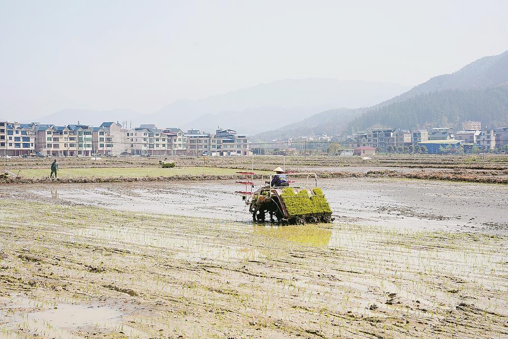 插秧機在田間插秧。柳浪漫 攝