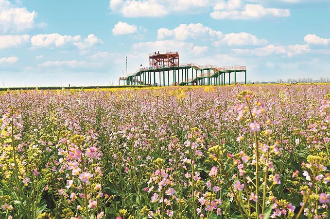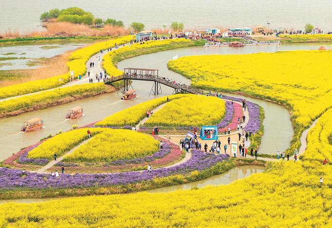烏篷船劃過(guò)粼粼波光,復(fù)古小火車穿梭于花田間……如果說(shuō)興化萬(wàn)畝垛田花海是“壘土成垛”而來(lái),那么高郵湖上油菜花田則是“化荒灘為金?!薄8哙]農(nóng)文旅集團(tuán)董事長(zhǎng)劉玲介紹,2018年,高郵啟動(dòng)新民灘生態(tài)修復(fù)工程,將荒廢湖灘打造成全國(guó)首個(gè)湖上油菜花田。依托高郵湖的濕地生態(tài),花海與鴨文化、漁文化深度融合,形成獨(dú)特景觀。