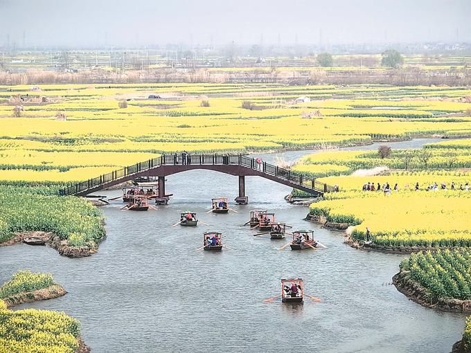 在蘇中,興化、高郵、如皋三市都不約而同“偏愛(ài)”油菜花。在興化千垛景區(qū),萬(wàn)畝垛田花海演繹“河有萬(wàn)灣多碧水,田無(wú)一垛不黃花”;在高郵湖上花海,“半城花海半城詩(shī)”的獨(dú)特景觀,吸引了眾多游客;在如皋平園池村,五彩油菜花好似打翻春日“調(diào)色盤”……