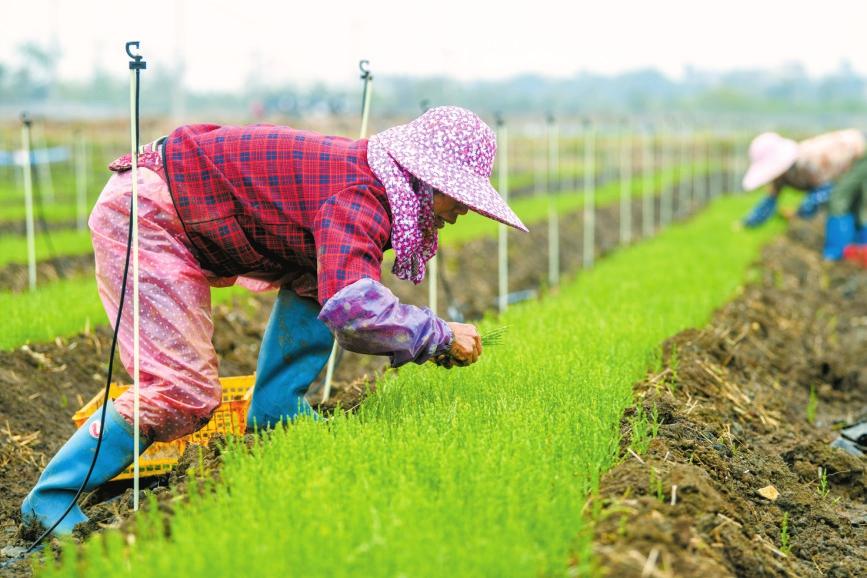 4月5日,美蘭區(qū)演豐鎮(zhèn)塔市村的鹽堿地里綠意盎然,農(nóng)戶正忙碌地將嫩綠的海蟲草苗移栽到大田。這片曾因海水侵蝕被破壞過的土地,如今借科技之力“種綠生金”,成了漁民“向岸上走”轉產(chǎn)轉業(yè)的“致富田”。