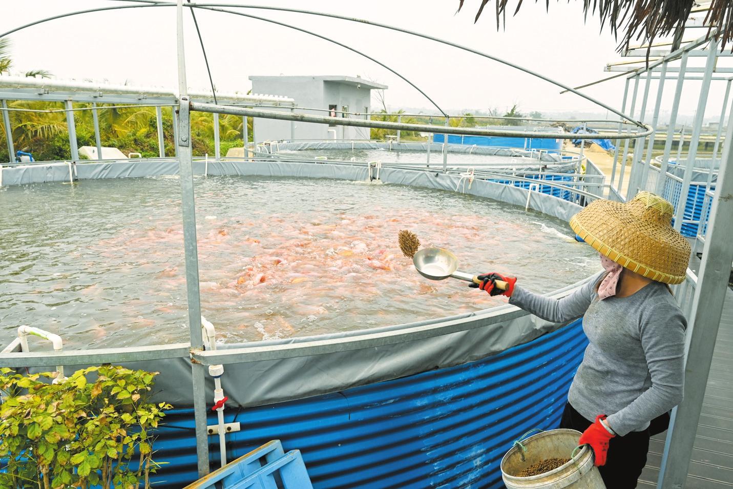 ??诩蠗派浆F(xiàn)代農(nóng)業(yè)工廠化養(yǎng)種產(chǎn)業(yè)基地內,工作人員在喂養(yǎng)咸淡水紅鯛魚。記者 石中華 攝