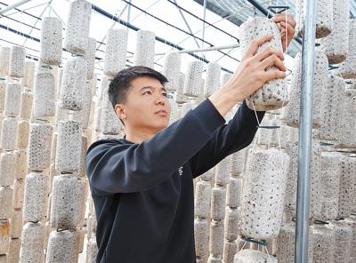 李強(qiáng)在木耳大棚里檢查菌包。張超 攝