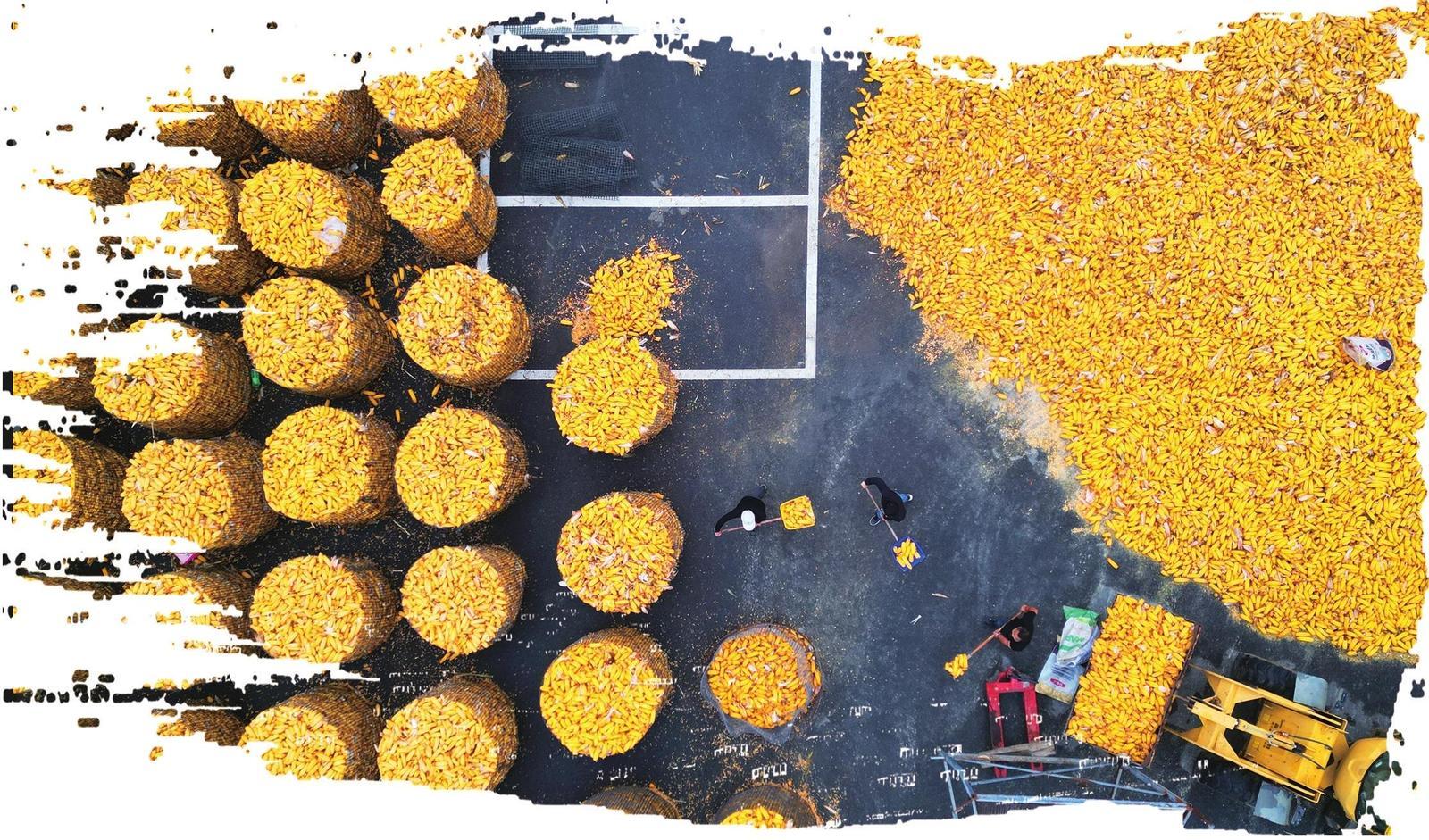 梨樹縣盧偉農(nóng)機農(nóng)民專業(yè)合作社社員在晾曬玉米。趙晶 航拍