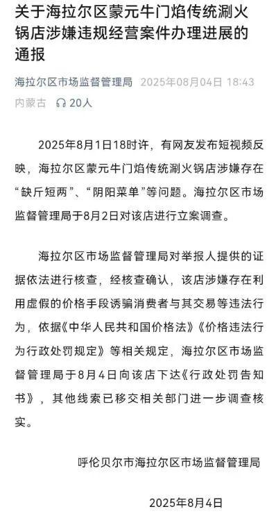 8月2日,海拉爾區(qū)市場監(jiān)管局也展開立案調(diào)查。最新通報顯示,8月4日,內(nèi)蒙古呼倫貝爾市海拉爾區(qū)市場監(jiān)督管理局針對涉事火鍋店涉嫌違規(guī)經(jīng)營一案向該店下達了《行政處罰告知書》。