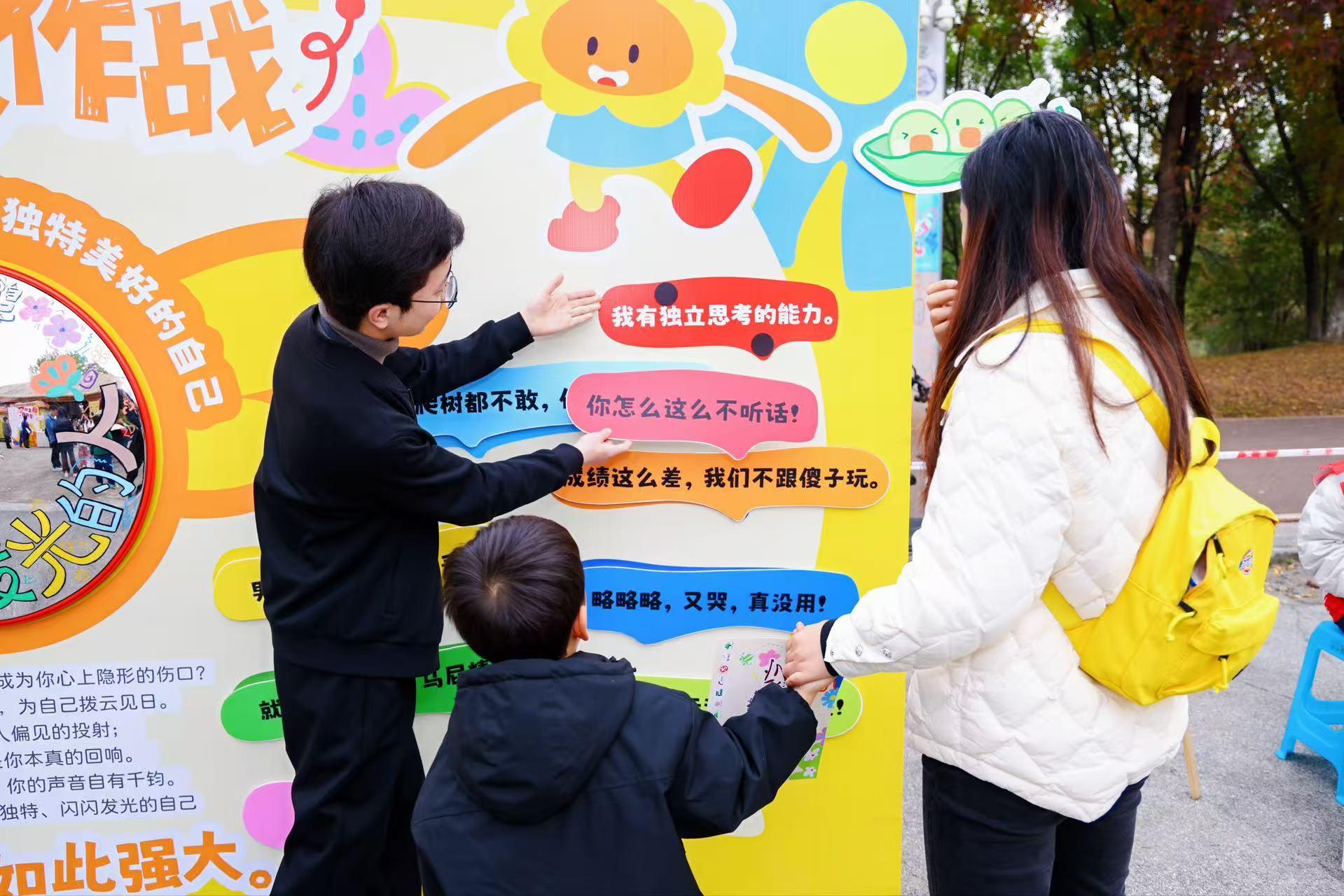 “愛的加油站”具象地展示了對抗暴力最柔軟的方式是愛。在“夸夸挑戰(zhàn)區(qū)”,不管是親子、情侶還是朋友,大家面對面真誠贊美、溫暖擁抱。直接的情感流動,讓每個人都感受到了人際關(guān)系中的安全感與支持力。