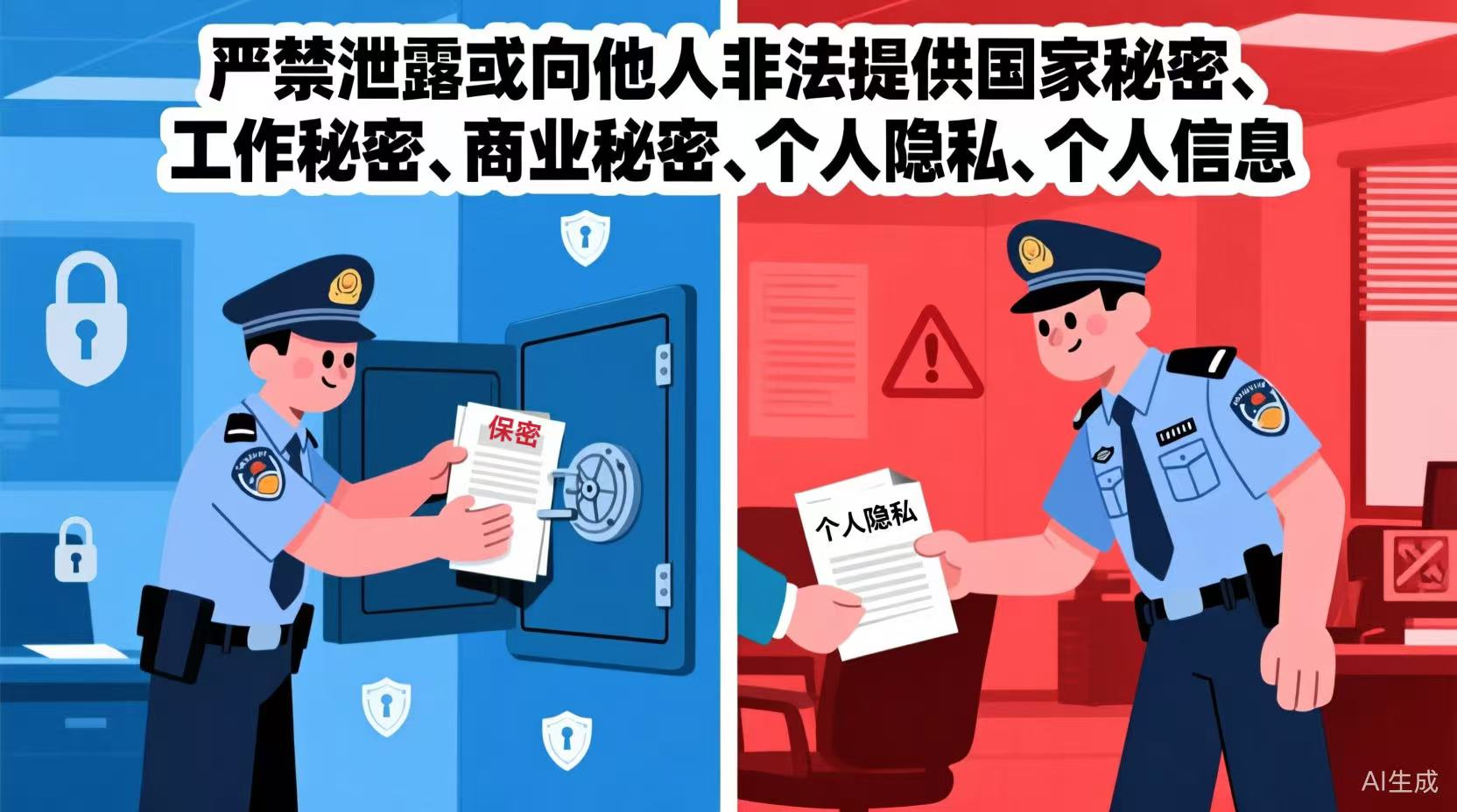 嚴(yán)禁泄露或向他人非法提供國家秘密、工作秘密、商業(yè)秘密、個人隱私、個人信息。