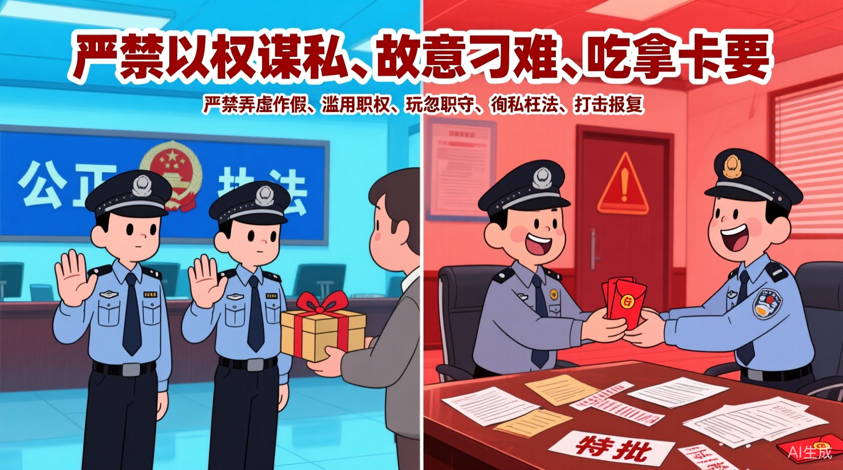 嚴(yán)禁以權(quán)謀私、故意刁難、吃拿卡要、弄虛作假、濫用職權(quán)、玩忽職守、徇私枉法、打擊報復(fù)。嚴(yán)禁從事有礙公正執(zhí)法的活動。嚴(yán)禁違規(guī)從事營利性活動。嚴(yán)禁違規(guī)向管理服務(wù)對象收取或攤派財物、要求其提供服務(wù)。嚴(yán)禁干預(yù)執(zhí)法活動、插手具體案件、過問案情。