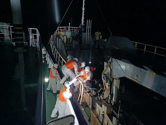 3月30日,涉案走私團(tuán)伙準(zhǔn)備在山東威海海域?qū)嵤┳咚椒缸锘顒?。得知線索后,山東海警局立即派遣威海海警局執(zhí)法艦艇前往目標(biāo)海域開展查緝。在執(zhí)法艦艇發(fā)現(xiàn)嫌疑船舶并靠近過程中,該走私船舶突然加速意欲逃離,海警執(zhí)法員果斷將其逼停,并組織船舶登檢。經(jīng)查,該船于3月23日自韓國裝載無合法來源和未經(jīng)檢驗(yàn)檢疫的日本進(jìn)口和牛肉后,關(guān)閉AIS設(shè)備進(jìn)入威海海域,被山東海警局當(dāng)場查獲。