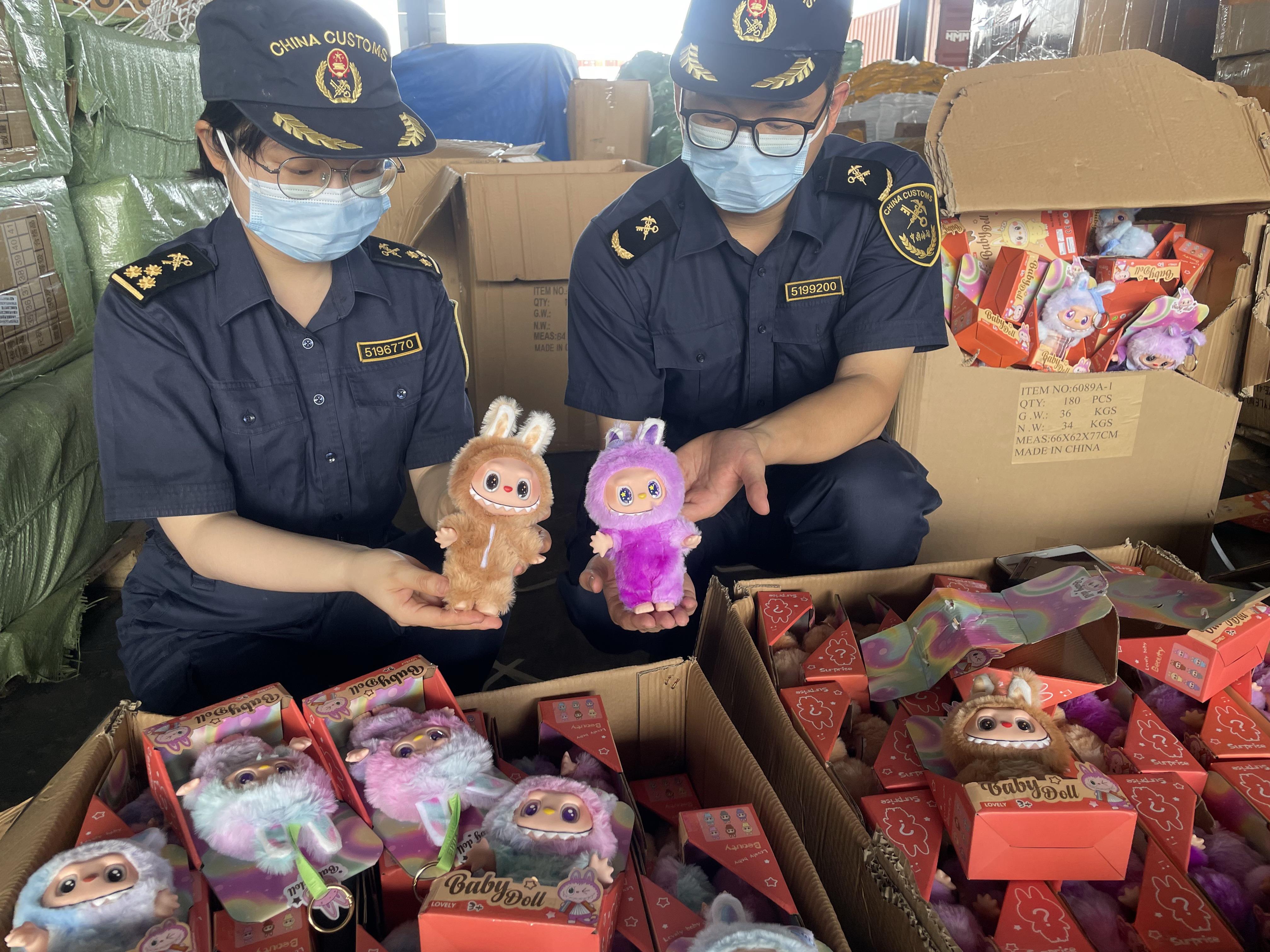 廣州海關(guān)所屬南沙海關(guān)關(guān)員在對(duì)一票申報(bào)為“玩具”的出口貨物進(jìn)行查驗(yàn)時(shí),發(fā)現(xiàn)該批貨物申報(bào)為“無品牌”,但紙箱中的毛絨玩具與泡泡瑪特當(dāng)前熱門的Labubu系列產(chǎn)品高度相似。經(jīng)聯(lián)系相關(guān)知識(shí)產(chǎn)權(quán)權(quán)利人確認(rèn),上述貨物為涉嫌侵犯其知識(shí)產(chǎn)權(quán)的產(chǎn)品。