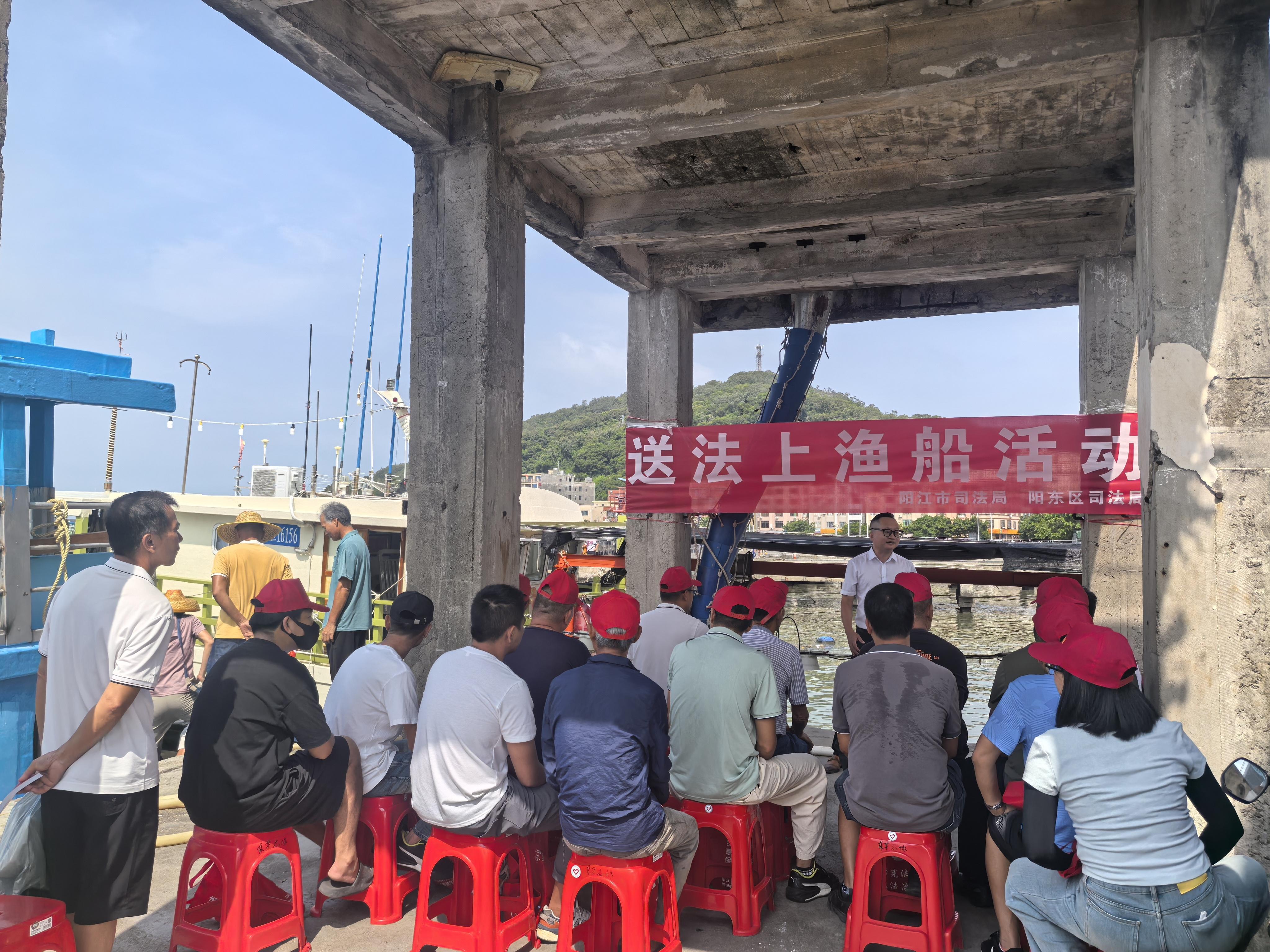 “師傅,這是民法典和法律援助指南,遇到糾紛可以照著上面的指引找我們!”休漁期的陽(yáng)東區(qū)東平鎮(zhèn)、陽(yáng)西縣沙扒鎮(zhèn)漁港內(nèi),普法志愿者分組登上漁船,將沉甸甸的“法治大禮包”送到漁民手中。