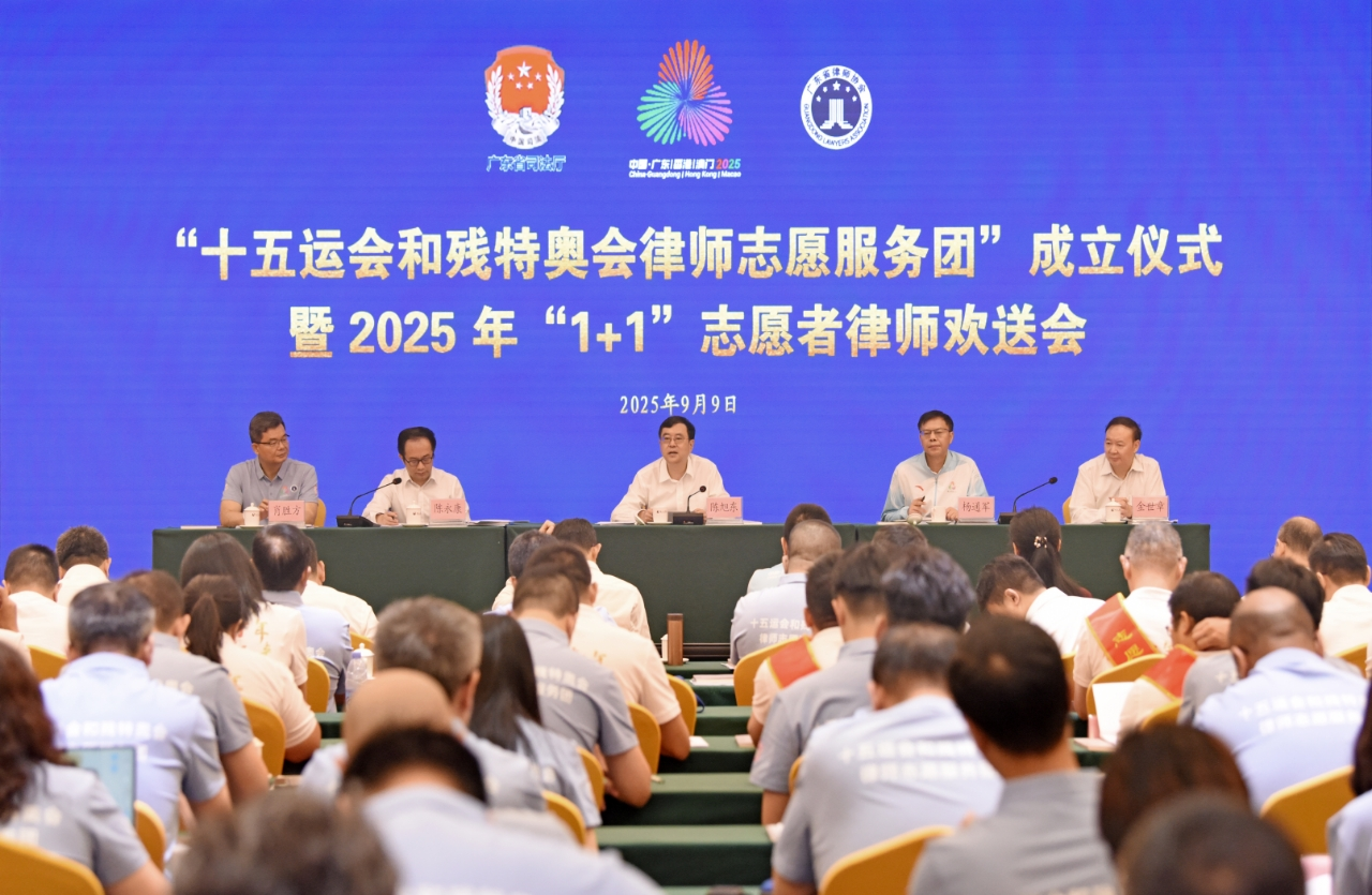 為全力保障“十五運(yùn)會(huì)和殘?zhí)貖W會(huì)”順利舉辦,廣東省律師協(xié)會(huì)積極響應(yīng)省委、省政府“當(dāng)好東道主”的號(hào)召,于9月9日在廣州正式成立“十五運(yùn)會(huì)和殘?zhí)貖W會(huì)律師志愿服務(wù)團(tuán)”,并舉行2025年“1+1”志愿者律師歡送會(huì)。廣東省司法廳黨委書記、廳長(zhǎng)陳旭東出席儀式并講話,省司法廳黨委委員、副廳長(zhǎng)陳永康主持活動(dòng)。