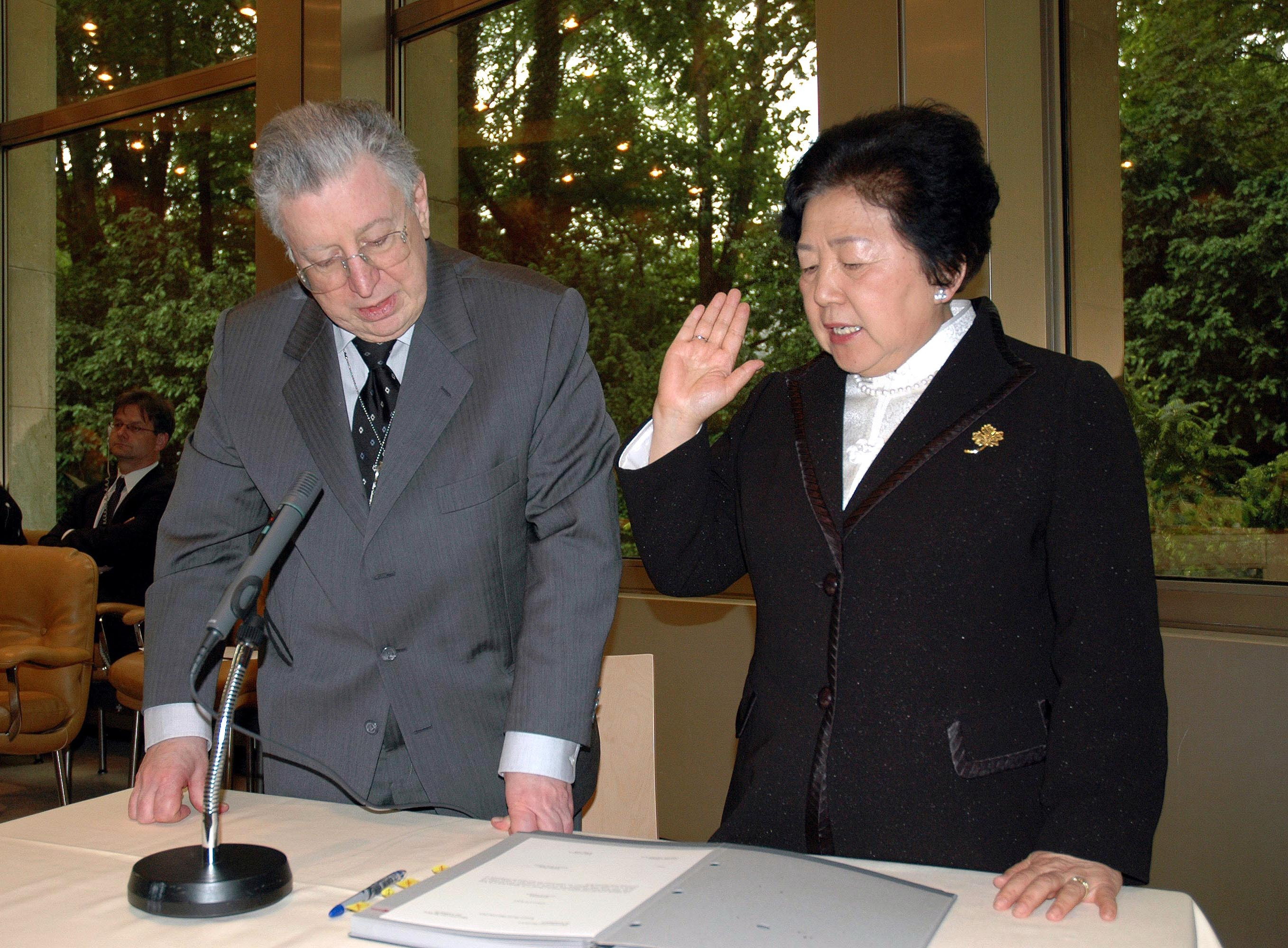 張月姣(右)在日內瓦世界貿易組織總部宣誓,正式就任世貿組織上訴機構法官(2008年5月21日攝)。