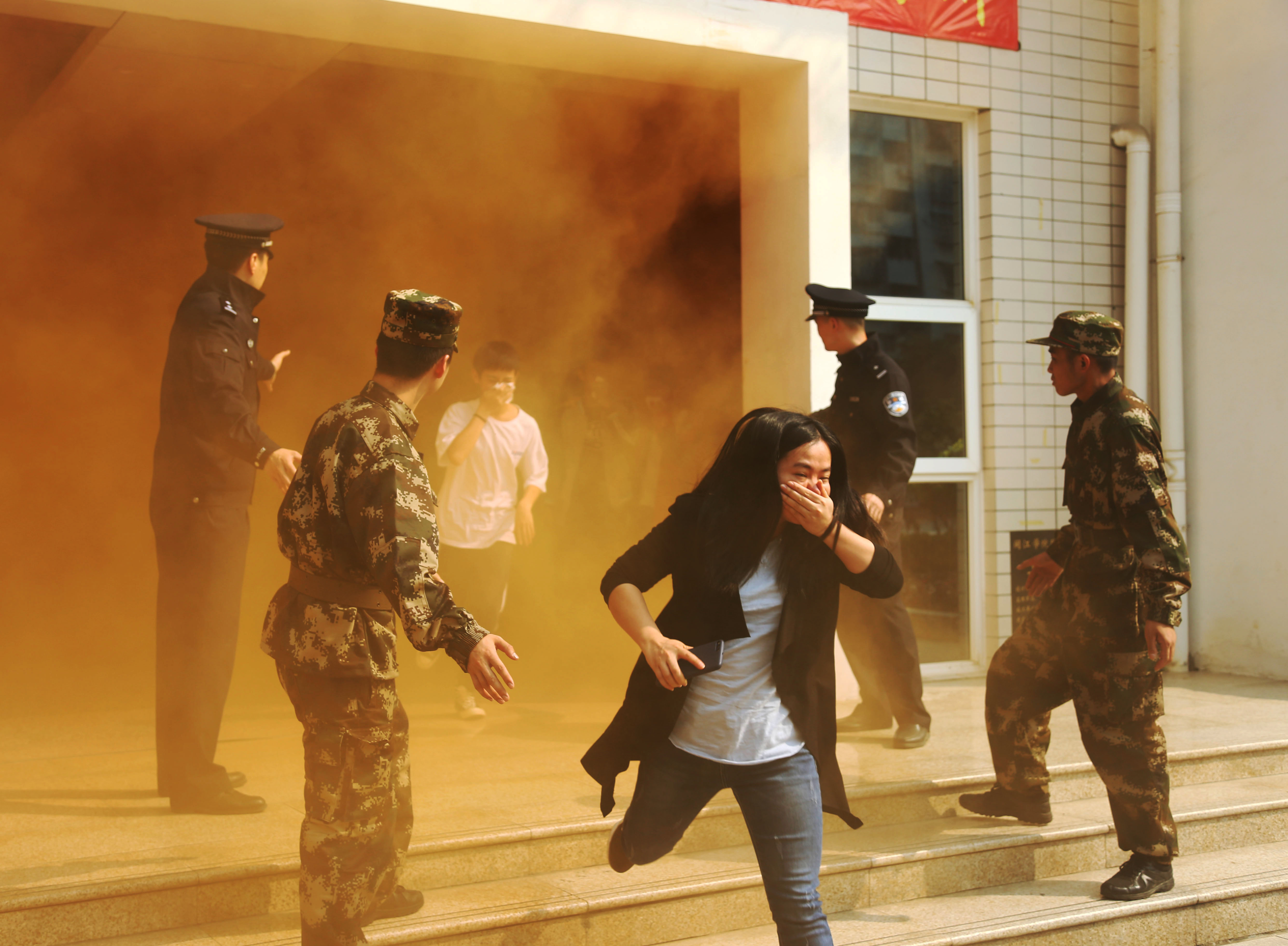 圖為演練現(xiàn)場民警同消防官兵一起疏導(dǎo)學(xué)生離開。