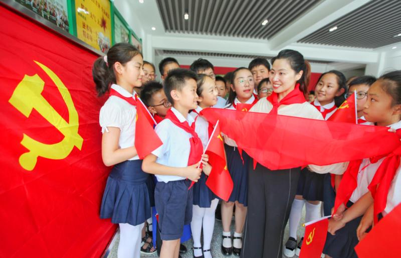 圖為少先隊輔導(dǎo)員給小朋友講解紅領(lǐng)巾知識。